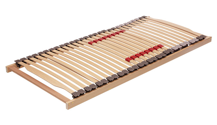 Die zwanzig 38 mm breiten Feder- sowie die zwei 68 mm breiten Abschlussleisten aus Buchenschichtholz bilden die Basis der AVENTURA Exclusive Unterfederung. 12 schmale Buche-Federleisten in 4 mechanischen Schulterabsenkungen sorgen für eine flexible Schulterkomfortzone. Durch jeweils drei Doppelleistenpaare mit 12 arretierbaren Schiebern zur Härteregulierung können die Lordose- sowie die Beckenzone individuell eingestellt werden. Die Lordosezone ist zusätzlich mit zwei mechanischen Höhenverstellern ausgestattet. Die 28 flexiblen Kautschukkappen sorgen für matratzenbreite Leistenfederung.